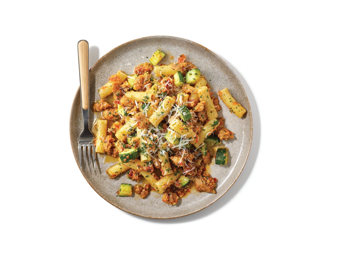 - Preheat oven to 350°F. Bring water to a boil for pasta. Drain tomatoes (reserving oil; about ½ cup). Remove basil and parsley leaves from stems (about 1 cup each). Slice zucchini into fourths lengthwise, then cut into ½-inch pieces (about 3 cups). Grate cheese (½ cup). Remove sausages from casings (wash hands).
