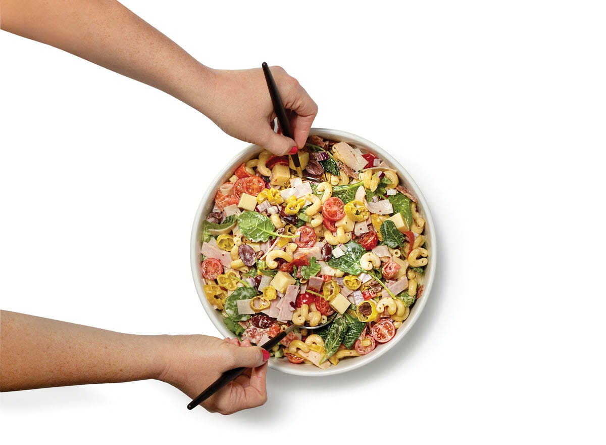 - Place pasta, tomatoes, olives, pepperoncini, mozzarella, all meats, onions, tri-pepper mix, and kale in large bowl. Add dressing mixture and toss to coat. Top with grated Parmesan, if using; serve.