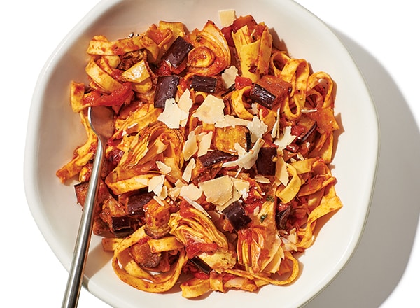- Bring water to boil for pasta. Drain artichoke hearts, then coarsely chop. Cook pasta according to package instructions. Meanwhile, stir artichokes and eggplant mixture into tomato sauce. Drain pasta (reserve 1 cup pasta water). Add drained pasta to tomato sauce and toss to coat (if sauce is thick, use pasta water to thin as needed). Serve pasta mixture garnished with cheese.