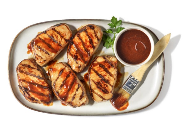 - Preheat grill (or grill pan) on medium-high. Coat pork with spray and grill 4–6 minutes on each side, turning often, until pork is 145°F. Brush with reserved sauce during last minute of grill time. Serve.