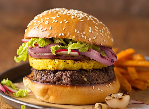 - Place burgers on bottom halves of buns; top with pineapples, red onions, radishes, and cabbage. Complete with top halves of buns. Serve.