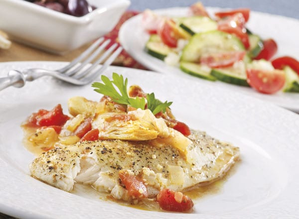 - Add fish and top with artichokes, tomatoes, wine, and remaining ½ teaspoon Greek seasoning. Cover and cook 8–10 minutes, stirring vegetables once, until centers of fillets flake easily and are 145°F. Serve.