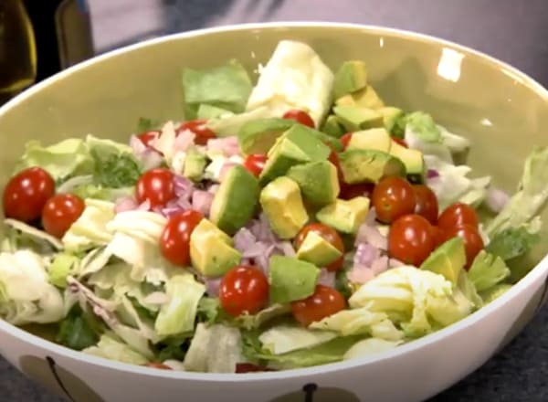 - Add salad blend, tomatoes, and onions. Halve avocado, scoop out flesh, and cut into bite-size pieces. Add to salad; toss to blend. Serve.