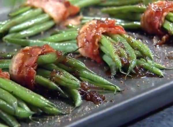 - Gather 10–12 beans into a bundle; wrap 1 bacon slice around center and place seam-side down on baking sheet. Repeat with remaining beans and bacon. Coat tops of bundles with spray, then season with salt and remaining ¼ teaspoon pepper. Bake 4–5 minutes until bacon is lightly crisped.