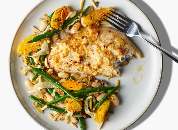 - Place in large bowl: canned beans, green beans, fennel, oil, rosemary, and remaining 1 ½ teaspoons seasoning, 1 teaspoon orange zest, and ½ teaspoon garlic; toss to coat. Arrange vegetable mixture around fish, then top with orange segments and almonds; bake 15–18 minutes until centers of fillets flake easily and are 145°F. Serve fish over vegetables.