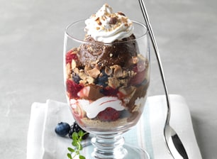 - Divide evenly among 4 (16-oz) glasses (or sundae dishes): one-half each graham crackers, berry jam, bananas, and berries, and one-third each whipped topping and almonds. Top each with ½ cup ice cream; repeat for a second layer. Finish with whipped topping and almonds; serve.