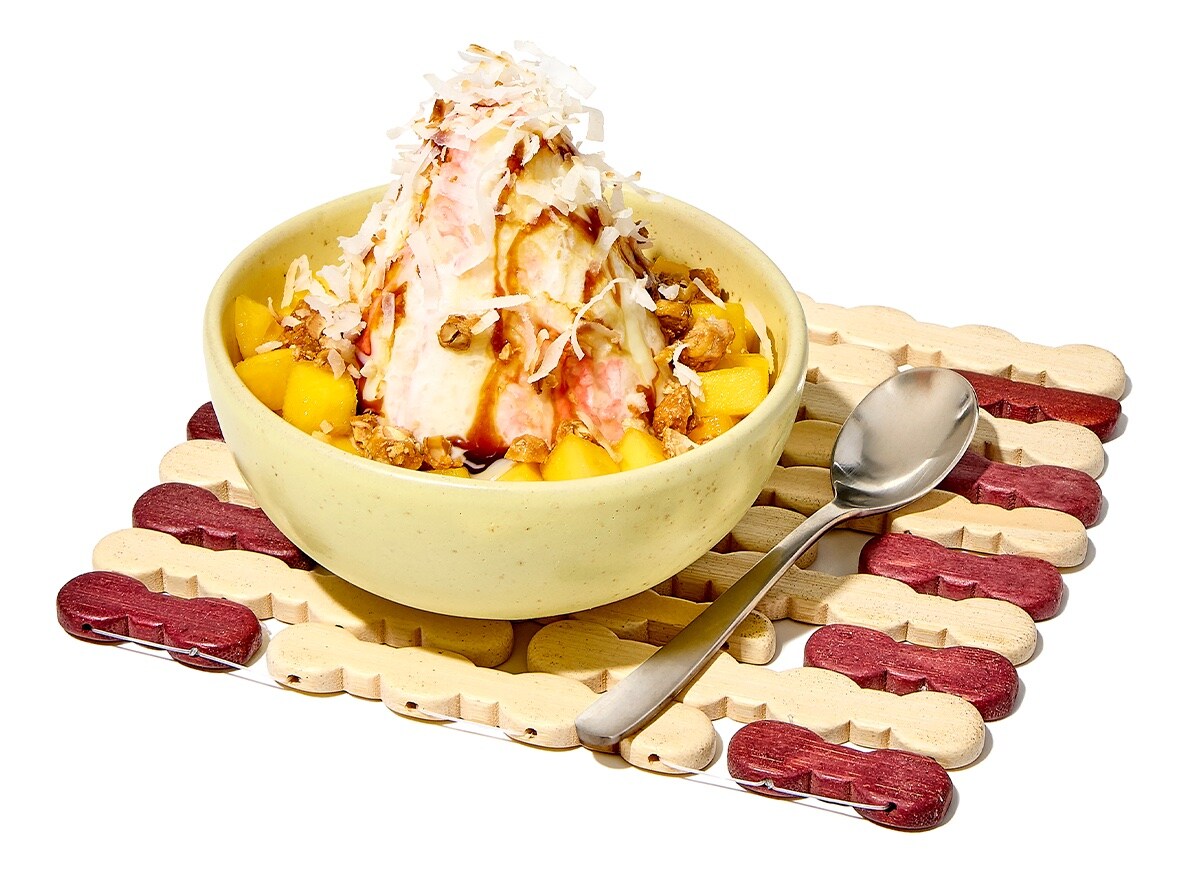 - Scoop mixture into 2 bowls and form into volcano shapes. Sprinkle mango around shaved ice; drizzle evenly with strawberry sauce, condensed milk, and date syrup. Sprinkle with cashews and coconut. Serve immediately.
