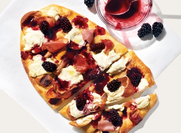 - Preheat oven to 450°F. Tear prosciutto into small pieces. Place dollops of ricotta and blackberry mixture on grilled flatbreads. Top each with prosciutto and remaining fresh blackberries. Bake 12–13 minutes. Remove from oven, drizzle with truffle oil, and serve immediately.