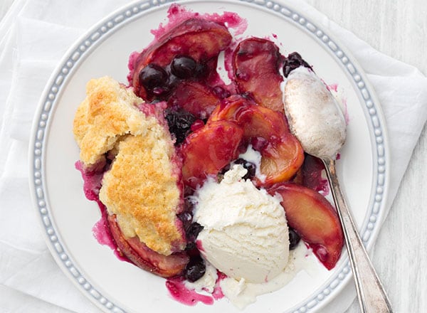- Preheat oven to 375°F. Peel peaches, if desired, and remove pits; cut peaches into ¾-inch-thick wedges (about 6 cups). Place in large bowl: peaches, blueberries, ⅓ cup sugar, cornstarch, brown sugar, lemon juice, and ⅛ teaspoon salt; stir to combine. Transfer mixture to deep, oven-safe 12-inch skillet (or baking dish).