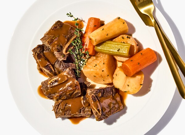 - Combine potato starch and water. Pour into stock mixture, whisking continuously until fully incorporated. Simmer 2–3 minutes, stirring occasionally, until mixture thickens. Cut each rib into 4 pieces. Serve beef with vegetables and gravy on the side.