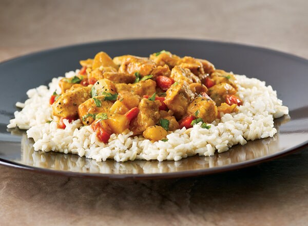 - Coat chicken with spray, then season with salt, pepper, and curry powder. Add chicken to vegetables; cook and stir 3–4 minutes or until chicken has browned on all sides. Prepare rice following package instructions.