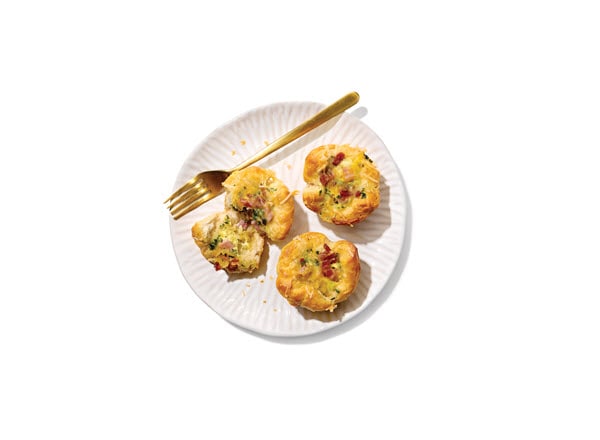- Remove muffin pan from oven; use a measuring cup to press dough firmly down into cups to form crusts. Fill evenly with ham, bacon, potato mixture, and egg mixture. Top evenly with remaining ½ cup cheese.