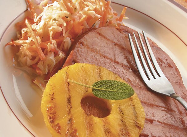 - Cut pineapple into four ½- to 1-inch thick slices and place on grill; close lid. Grill 1-2 minutes until warm. Serve with ham.
