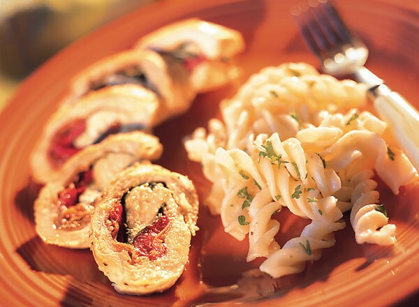 - Roll chicken around filling (wash hands), then fold plastic wrap over chicken, and roll until plastic wrap is tightly sealed. Twist ends of wrap and tuck under chicken roll. (Rolls should be about 2 inches thick by 4 inches long.) Place in shallow microwave/oven-safe baking dish. Microwave on HIGH 4 minutes or until chicken cooks slightly and holds its shape.