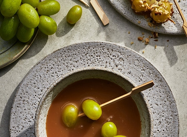 - Thread grapes onto skewers. Finely crush walnuts. Place caramel in microwave-safe bowl; microwave on HIGH for 1 minute or until warm.