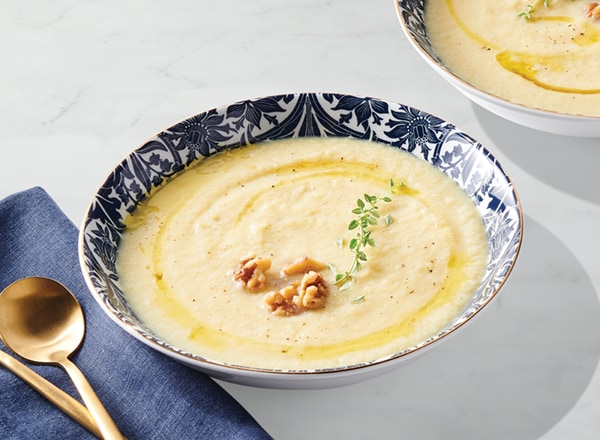 - Remove thyme sprigs. Puree soup in blender until smooth, working in batches (to avoid injury, do not fill blender more than halfway and do not seal lid). Divide soup among serving bowls. Top with walnuts and extra-virgin olive oil, if using.