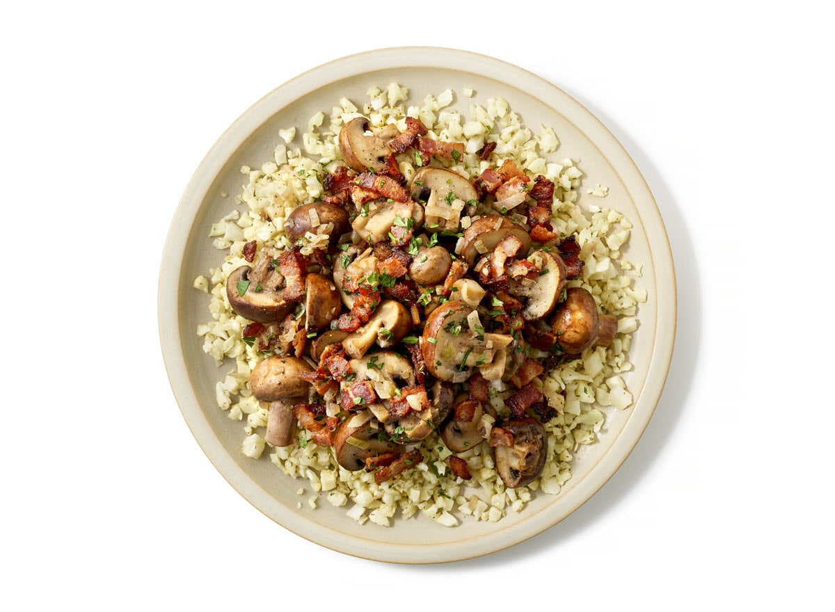 - Add butter to pan and let melt. Add cauliflower rice and remaining ½ teaspoon salt. Cook 2–3 minutes, stirring occasionally, until tender. Spread cauliflower mixture on platter; top center with mushroom mixture and bacon. Sprinkle with parsley. Serve.