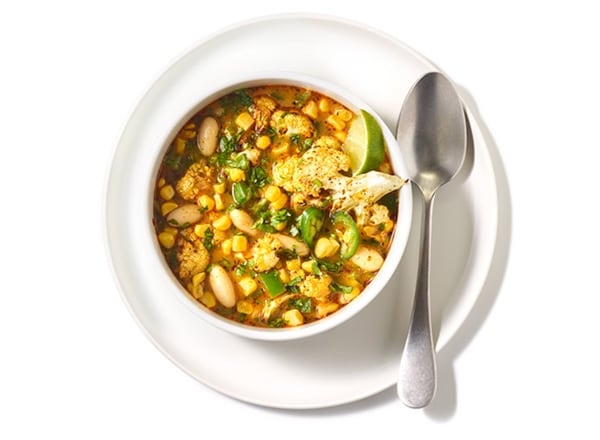 - Stir pureed bean mixture, corn, roasted cauliflower, and remaining beans into pot; bring to a simmer and cook 2 minutes. Stir in lime juice and cilantro. Serve.