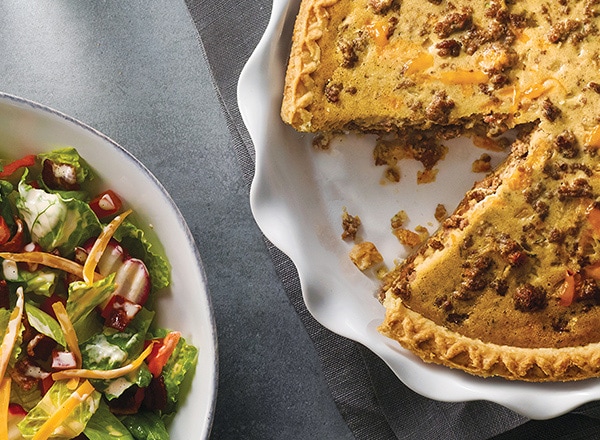 - Whisk in large bowl: eggs, milk, mayonnaise, flour, and seasoning until blended; stir in meat mixture and cheese. Pour mixture into pie crust; bake 30–35 minutes until center of pie is set and beef is 160°F. Let stand 5 minutes to cool before serving.