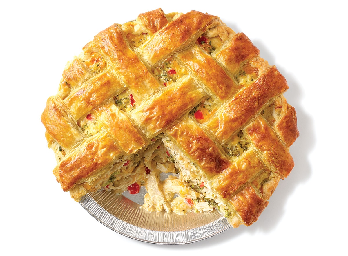 - Remove from heat; stir in cheese, chicken, and broccoli until cheese has melted. Place piecrust on baking sheet to catch any drips; pour filling evenly into piecrust. Starting from 1 long end, cut puff pastry into 8 equal strips. Arrange overlapping strips across pie, forming lattice. Beat egg and brush over puff pastry.