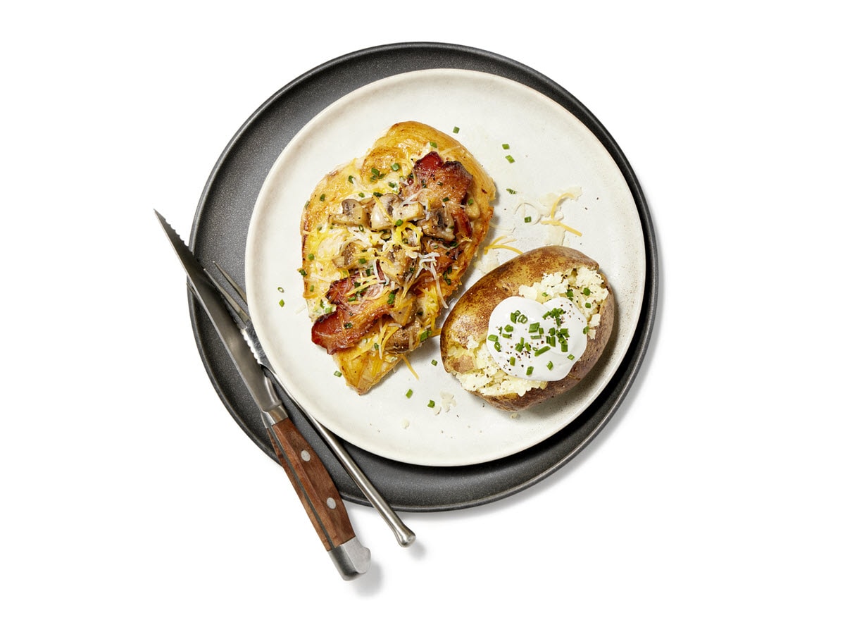 - Cut 2-inch-long slit across top of each potato; season with remaining ½ teaspoon salt. Top potatoes evenly with butter, sour cream, and chives. Serve chicken with potatoes.