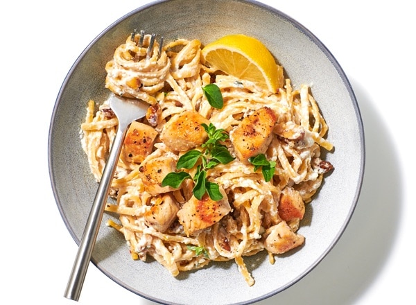 - Pour reserved pasta water over cheese mixture and stir until blended. Add pasta, tossing 1–2 minutes until pasta is well-coated and mixture has thickened. Serve topped with chicken.
