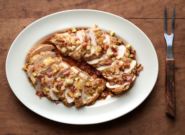 - Transfer chicken to baking sheet with cut side up. Let chicken stand 5 minutes to cool. Meanwhile, cut cheese and apple into ¼-inch-cubes (½ cup each); add to bread crumbs. Chop ham; stir into bread crumb mixture until well blended.