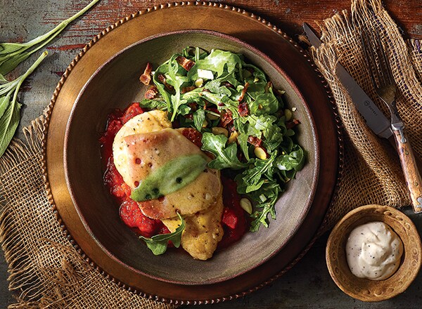 - Place oil in pan, then add chicken; cook 3–4 minutes on one side. Turn chicken and reduce heat to medium. Place one prosciutto slice on each cutlet and sprinkle with pepper; add one sage leaf and top with one cheese slice. Cover and cook 3–4 more minutes and until chicken is 165°F.