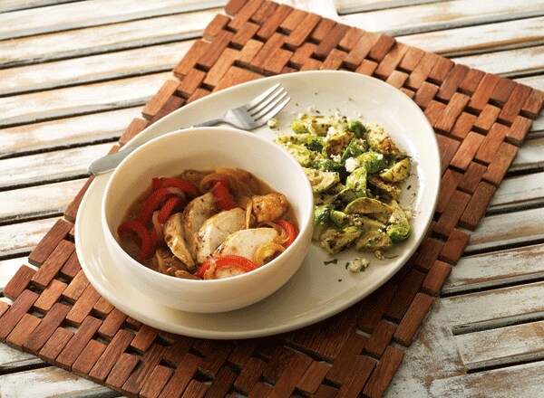 - While broth reduces, complete Brussels sprouts; slice chicken and serve (15 minutes)