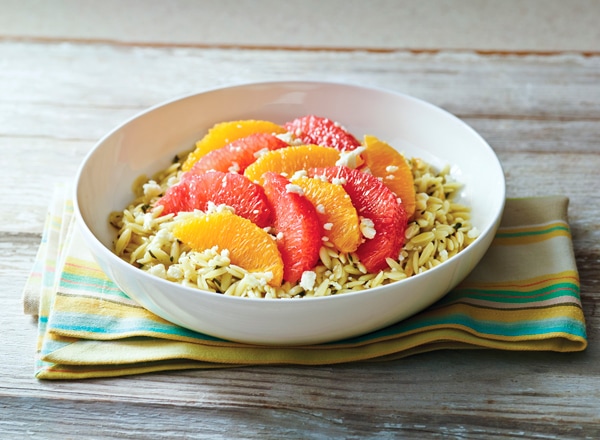 - Chop basil leaves finely (¼ cup). Stir into dressing: pasta, lemon zest, tangerine zest, and basil. Peel orange and grapefruit; separate segments. Top salad with citrus segments and cheese. Serve.