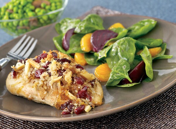 - Remove chicken from oven. Pour maple sauce over chicken and sprinkle with cranberry-almond topping. Bake 5–10 more minutes until chicken is 165°F. Slice chicken and serve.