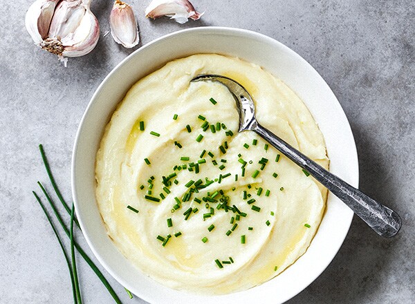 - Combine in separate medium stockpot: cream, butter, and garlic; bring to simmer on medium. Drain potatoes (reserve 2 cups potato water) and add cooked potatoes to blender with warm cream mixture; blend until smooth. (Add potato water in 2 tablespoon intervals if mixture is to dry, until smooth.)