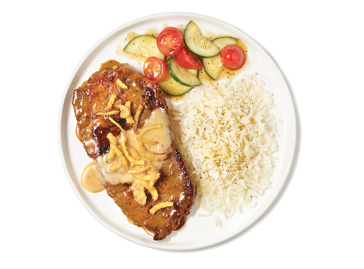 - Top steaks with reserved dressing mixture and sprinkle with fried onions. Serve with rice.