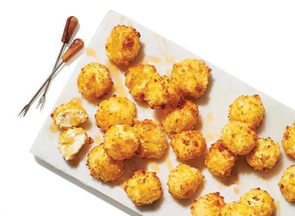 - Coat cheese balls with spray, then arrange in even layer in air fryer basket. Cook 4–5 minutes until golden. Drizzle with honey; serve.