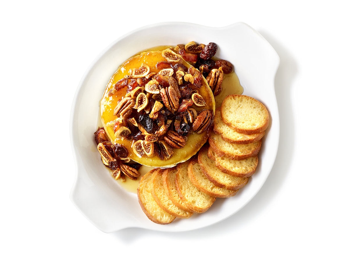 - Top Brie with figs, dates, raisins, and pecans, then drizzle with maple syrup. Bake 4–5 more minute until cheese is gooey and toppings are warm. Serve immediately with baguette slices.