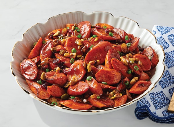 - Add pistachios, walnuts with cranberries, raisins, green onions, and carrot mixture to bowl with vinaigrette; toss to coat. Serve warm or chill until ready to serve.