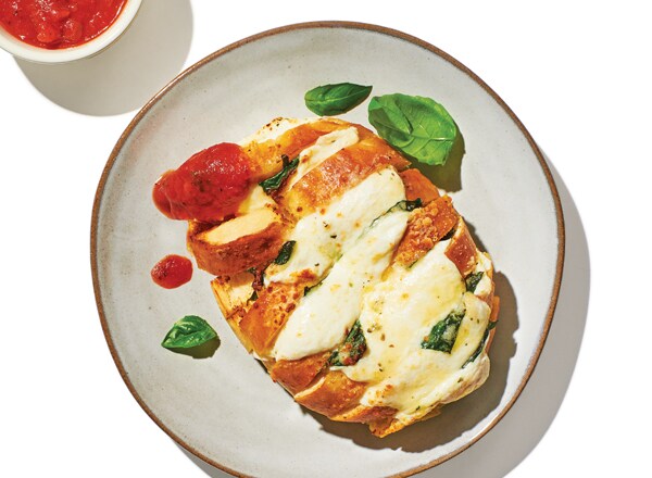 - Place mozzarella and basil into cuts. Drizzle butter over bagels, then sprinkle with Parmesan. Bake 8–10 minutes until bagels are golden and cheese has melted. Serve with warm pasta sauce, if desired.