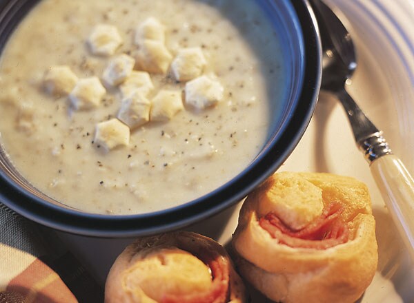- Prepare potato soup through step 2 and place pinwheels in oven (10 minutes)