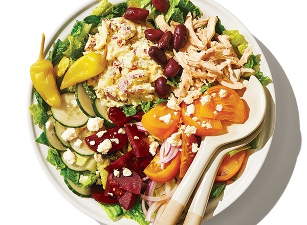 - Combine lettuce and ⅓ cup dressing in large bowl until coated. Transfer dressed lettuce to large serving platter. Mound potato salad in center of lettuce, then arrange onion, cucumber, tomatoes, beets, olives, and chicken around potato salad. Top with feta and arrange pepperoncini around outside of salad; drizzle salad with remaining ⅓ cup dressing. Serve.