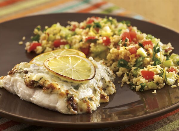 - Combine cheese, mayonnaise, mint, dill, and lemon juice. Spread mixture evenly over fish; top each fillet with 2 overlapping lemon slices. Place in oven on middle rack; bake 10 minutes.