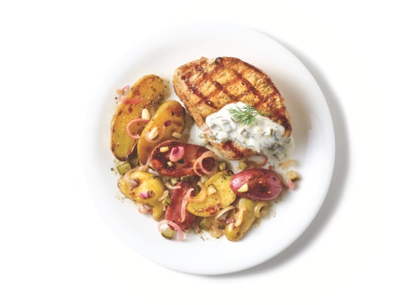 - Season pork with 1 teaspoon seasoning and remaining 1 tablespoon oil (wash hands). Place pork on grill; cook 3–4 minutes on each side until grill-marked and 145°F. Combine yogurt, lemon zest, lemon juice, pickle juice, and remaining 1 teaspoon seasoning, ½ cup relish, and 1 tablespoon dill.