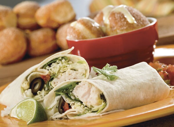 - Spread 1 tablespoon artichoke dip over each tortilla. Add fish strips down center; top with cabbage mixture, salsa, and olives. Fold lower edge of tortilla up over filling, fold right side over, and then roll tightly. Fluff rice with fork and serve.