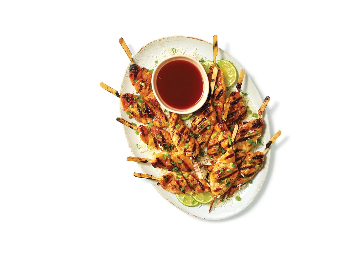 - Juice 4 limes (4 tablespoons); cut remaining lime into wedges. Slice green onions thinly. Combine in shallow dish: salt, ½ teaspoon garlic powder, ¼ teaspoon red pepper, 2 tablespoons lime juice, and 1 tablespoon aminos. Thread chicken onto skewers, then add to dish; turn to coat with marinade (wash hands) and let stand 20 minutes (or chill overnight) to marinate.