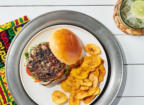 2. Cut dill pickles into thin, lengthwise slices. Chop green onions and cilantro coarsely. Combine in food processor: green onions, cilantro, shrimp, jerk paste, steak sauce, breadcrumbs, and egg (wash hands). Pulse 5–6 times until coarsely chopped and combined; chill 30 minutes.