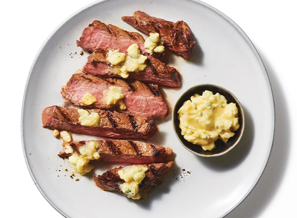 - Preheat grill (or grill pan) on medium-high. Remove steaks from marinade (discard marinade) and coat with spray; grill 3–4 minutes on each side until steaks are 125°F (for medium rare; warm red center), 130°F (for medium; warm pink center), or up to 170°F (for well done). Transfer steaks to cutting board and let stand 5–10 minutes before slicing; temperature will rise 5–10°F during this time. Top with blue cheese butter and serve.