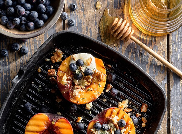 - Preheat grill (or grill pan). Cut peaches in half, removing the seed. Place brown sugar on a plate and lightly press peaches, cut side down, into sugar. Coat peaches with spray. Place peaches on grill, cut side down; grill 3–4 minutes, turning clockwise as needed, or until fruit is warmed and sugar has caramelized. Bake cake crumbles 4–5 minutes or until golden-brown and toasted.