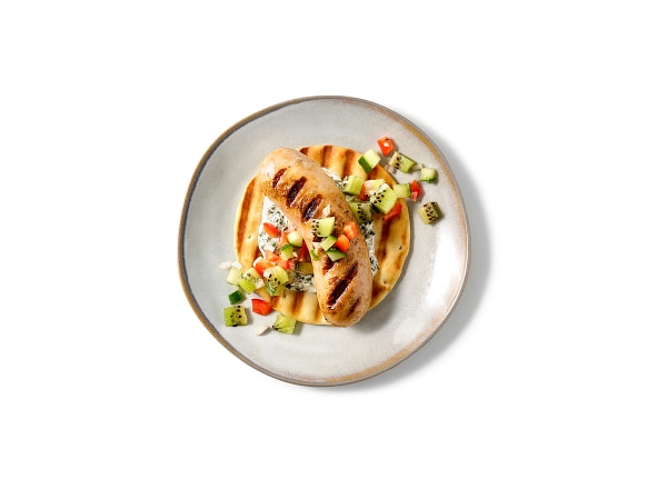 - Place naan rounds on grill and cook 1 minute on each side or until grill-marked and warm. Spread about 2 tablespoons yogurt mixture down center of each naan round; add sausages and top with kiwi relish. Serve.