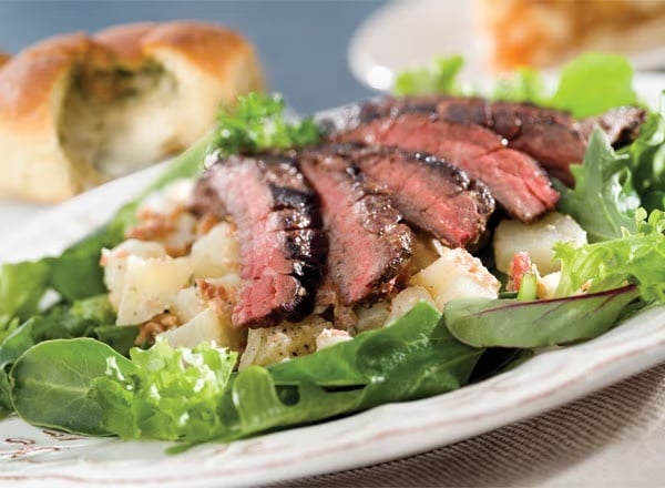- Stir salad dressing and bacon into potatoes until evenly coated. Arrange lettuce on serving platter; top with potato salad. Cut steak diagonally, against the grain, into thin ⅛-inch-thick slices. Arrange steak slices over salad and serve.