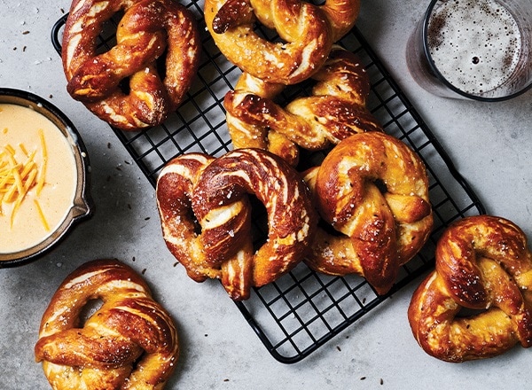 - Bake pretzels 10–12 minutes, until dark golden brown. Transfer to cooling rack and set aside 5 minutes before serving. Serve with spicy brown mustard (if desired) and Beer Cheese Sauce (see recipe).