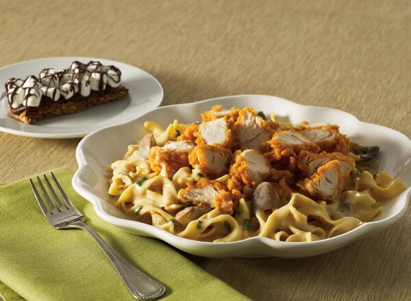 - Drain pasta; stir pasta and chives into mushroom mixture. Cut chicken into bite-size pieces; arrange over pasta and serve. (Makes 6 servings.)